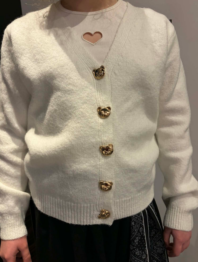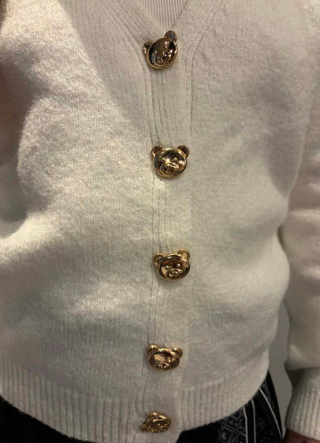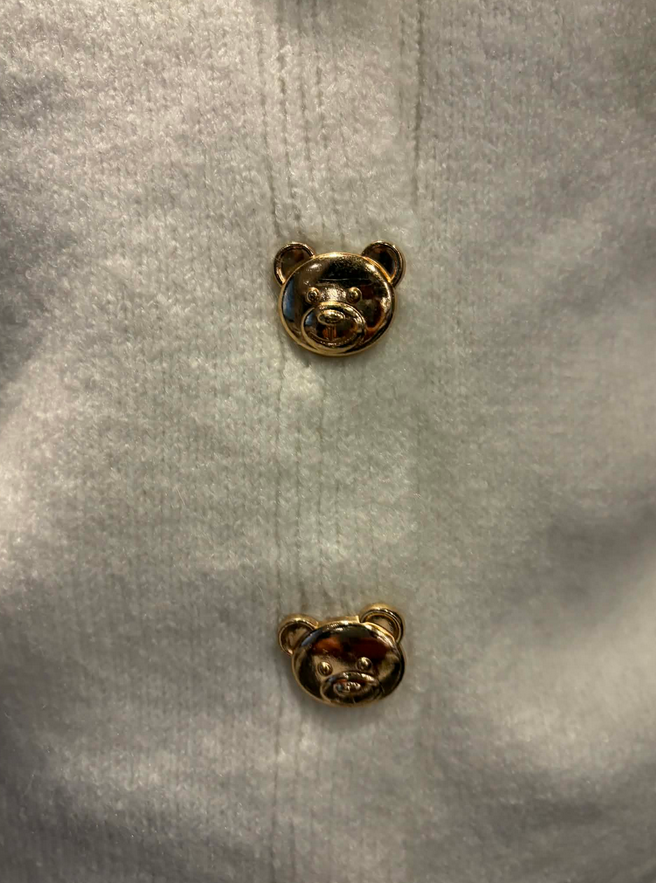 Sweterek dziewczęcy w klasycznym białym kolorze łączy elegancję z uroczymi, dziecięcymi detalami. Posiada dekolt w kształcie litery V, który nadaje mu stylowego wyglądu i sprawia, że dobrze układa się na sylwetce. Sweterek jest zapinany na guziczki, które wyróżniają się złotym kolorem, a dodatkową ozdobę stanowią guziki w kształcie główek misiów, nadające całości wyjątkowego, dziewczęcego uroku. Wykonany z miękkiego i przyjemnego w dotyku materiału, zapewnia komfort noszenia i doskonale sprawdzi się zarówno na co dzień, jak i podczas bardziej eleganckich okazji.