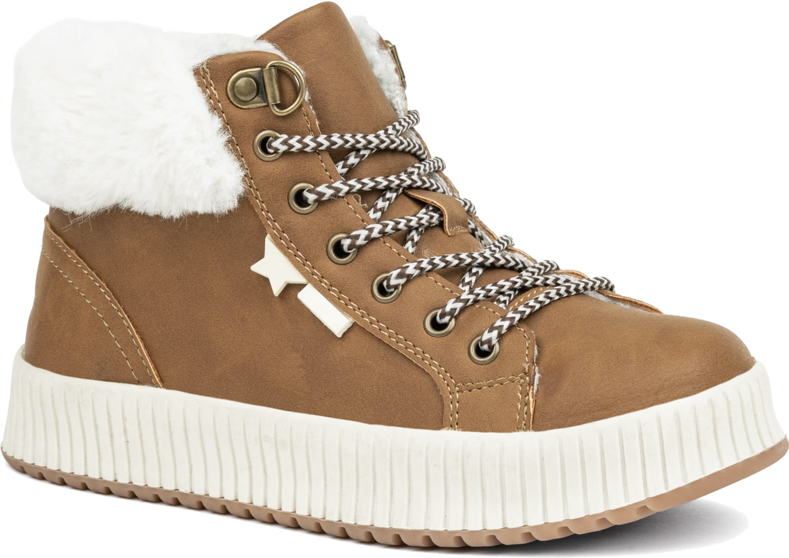 Buty dziecięce zimowe w kolorze karmelowym charakteryzują się klasycznym i ciepłym odcieniem, idealnym na zimowe dni. Są one wiązane na sznurówki, co pozwala na regulację i dobre dopasowanie do stopy dziecka. Wewnątrz butów znajduje się ocieplenie, zapewniające komfort termiczny podczas mroźnych dni. Materiał zewnętrzny jest wytrzymały, odporny na warunki atmosferyczne. Stylowy i funkcjonalny design sprawia, że buty te są zarówno praktyczne, jak i modne na sezon zimowy.
