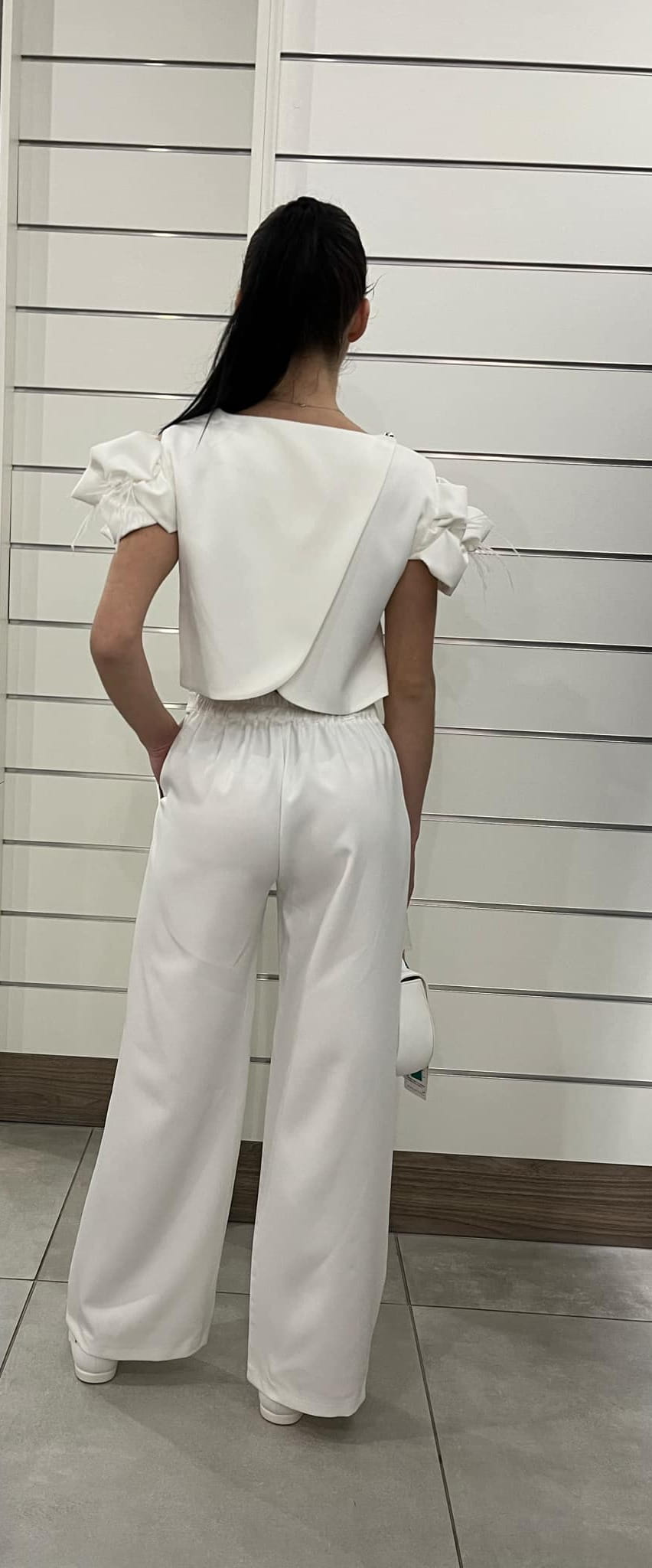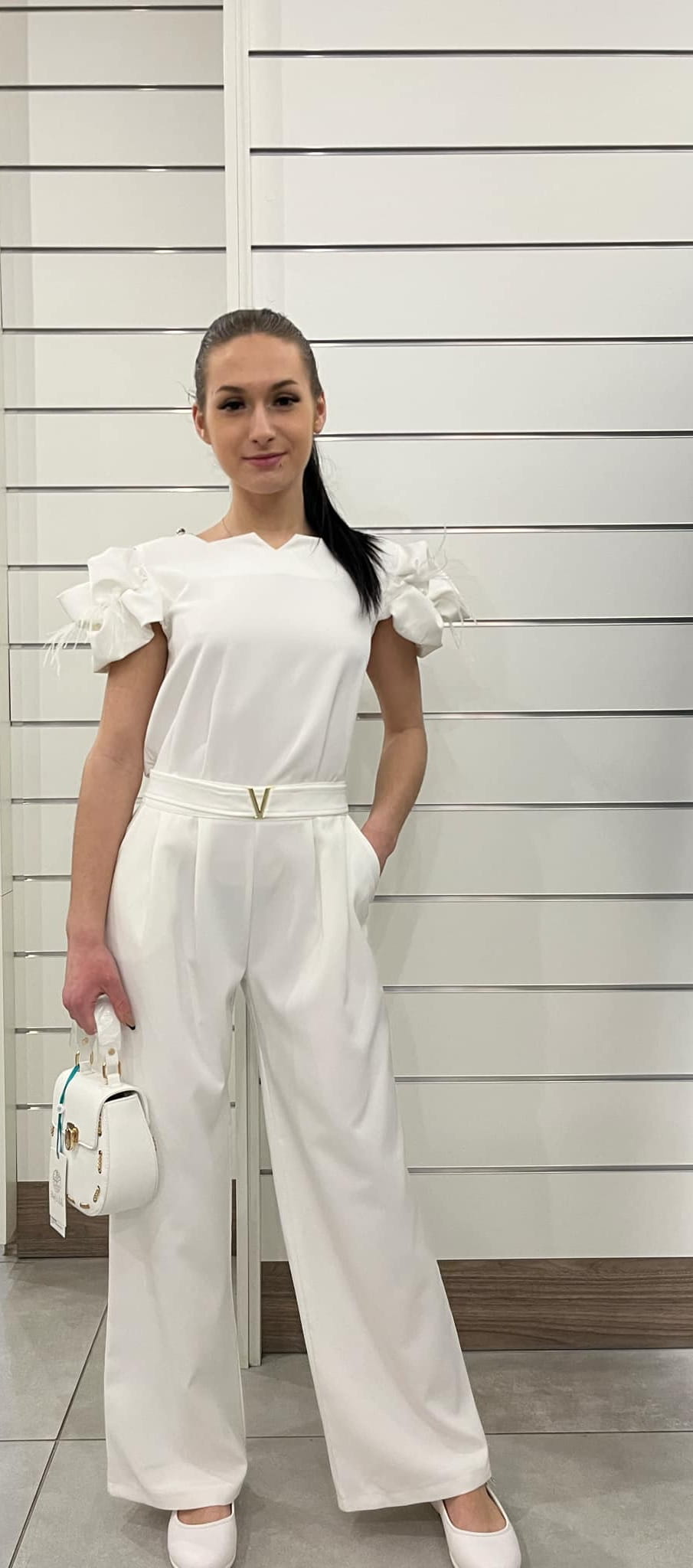 Elegancki kombinezon dla dziewczynki w śmietankowym kolorze to wyjątkowa propozycja na specjalne okazje. Jego stylowy fason łączy klasyczną elegancję z nowoczesnym designem. Górna część jest dopasowana i wykonana z wysokiej jakości, miękkiej tkaniny o subtelnym, matowym wykończeniu. Dekolt jest klasyczny, delikatnie zaokrąglony, co nadaje całości szyku. Na ramionach znajduje się efektowna ozdoba, która dodaje kombinezonowi wyjątkowego charakteru. Eleganckie złote detale wkomponowane w strój podkreślają jego ekskluzywny wygląd. Mogą one występować w formie cienkich lamówek na rękawach, subtelnych pasków w talii lub delikatnych haftów, dodając całości delikatnego blasku. Nogawki są lekko rozszerzane, co nadaje stylizacji lekkości i wyrafinowania. Krój spodni zapewnia swobodę ruchów, a zarazem elegancki wygląd. Dzięki odpowiednio dobranemu materiałowi nogawki pięknie układają się przy każdym kroku. Kombinezon zapinany jest na plecach na guziki, co ułatwia jego zakładanie, a jednocześnie dodaje uroku dzięki starannie dobranym zapięciom, które mogą być utrzymane w złotej kolorystyce, aby harmonizować z resztą stroju. Ten elegancki kombinezon to doskonały wybór na wyjątkowe okazje. Śmietankowy odcień nadaje mu subtelności, złote wstawki dodają wyrafinowania, a ozdoba na ramieniu stanowi stylowy akcent. Klasyczny krój z nowoczesnymi detalami sprawia, że jest to idealna alternatywa dla sukienki, łącząca komfort i elegancję.
