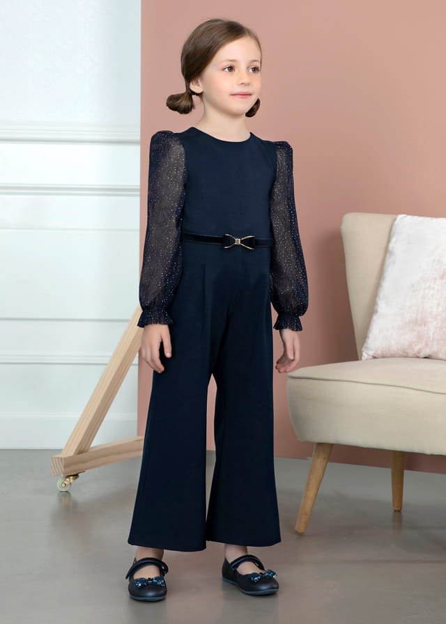 Elegancki kombinezon marki Abel&Lula to kwintesencja stylu, finezji i młodzieńczej elegancji. Wyróżniający się granatowy kolor, ozdobne długie rękawy, subtelna kokardka i ekskluzywny charakter sprawiają, że jest to idealny wybór na specjalne okazje, które wymagają zachowania klasy i gustu.