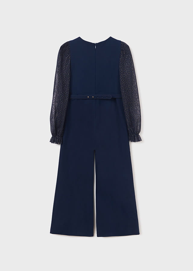 Kombinezon składa się z gładkiego materiału w głębokim odcieniu granatu, który w delikatny sposób podkreśla sylwetkę. Jednak to ozdobne długie rękawy stanowią jego najbardziej wyrazistą cechę. Subtelnie zdobione rękawy dodają kombinezonowi lekkości i romantycznego uroku tworząc harmonijny kontrast z głębokim granatem.