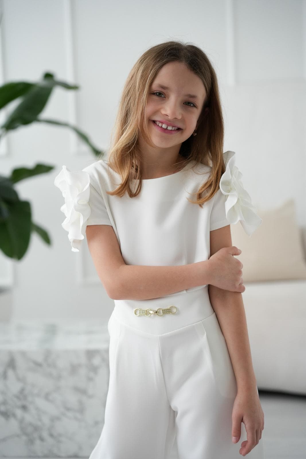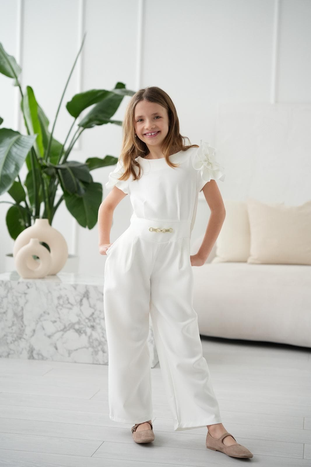 Kombinezon dziewczęcy Anbor z ozdobnym kwiatem na ramieniu śmietankowy