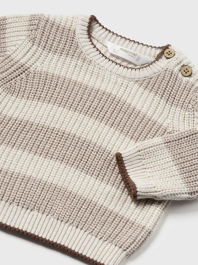 Chłopięcy sweterek w kremowym kolorze, ozdobiony subtelnymi beżowymi paskami, które dodają mu stylowego akcentu. Zapinany na guziczki przy rękawku, co pozwala na regulację i dodaje elegancji. Sweterek wykonany z miękkiego, przyjemnego materiału, zapewnia komfort i ciepło, idealny na chłodniejsze dni. Doskonały wybór do codziennych stylizacji, łączący klasyczny design z funkcjonalnością.