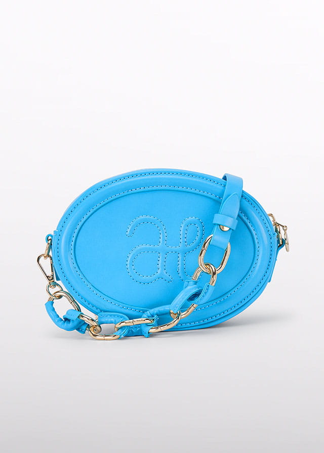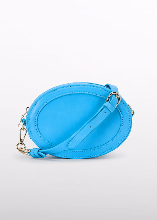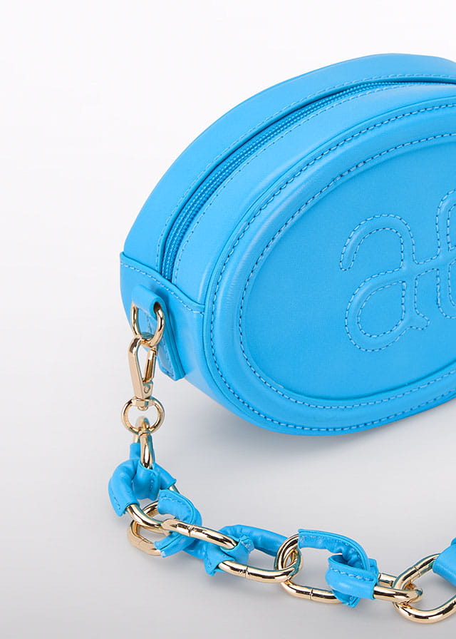 Dziewczęca torebka w kolorze błękitnym, owalna, wykonana z gładkiego materiału z delikatnym połyskiem. Na przodzie ozdobiona subtelnym, haftowanym monogramem. Zamykana na zamek błyskawiczny, zapewniający wygodę użytkowania. Pasek składa się z dwóch części – regulowanego, skórzanego odcinka oraz eleganckiego łańcuszka z ozdobnymi, błękitnymi ogniwami i złotymi akcentami. Całość prezentuje się stylowo i dziewczęco, doskonale uzupełniając eleganckie i codzienne stylizacje.